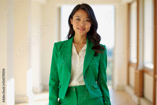 Woman in Green Suit Standing in Hallway with Confident Posture