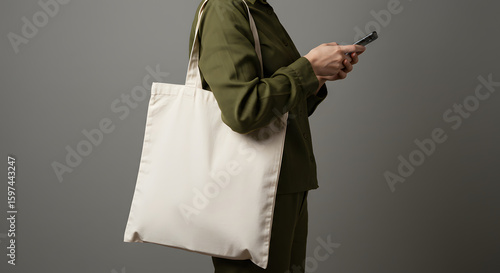 woman, tote bag, shopping bag, green shirt, grey background, minimal, simple, modern, casual attire, smartphone, mobile phone, half face, studio shot, fashion, style, clean, elegant, calm, relaxed, sustainable, environmentally friendly, advertising, marketing, branding
