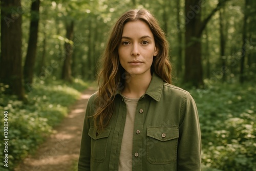green jacket, professional, authentic, realistic, portrait, timberland, create, forest, jacket, modern, nature, people, serene, brand, green, image, photo, woman, logotype, path, text, advertisement
