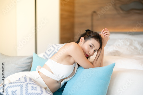 Woman in sexy white top laying down on sofa in bedroom.