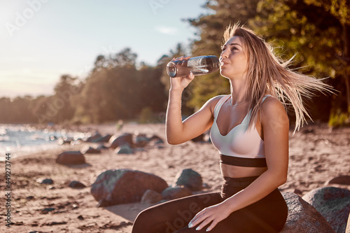 Woman in sportswear drinks water after jogging on sandy sea beach.