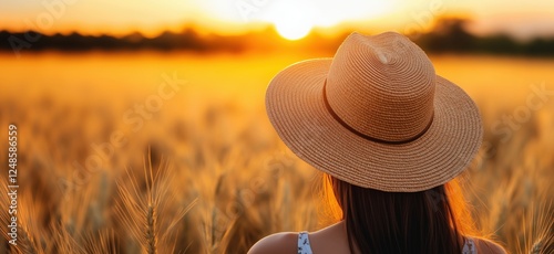 woman, leghorn, sunset, wheatfield, golden hour, nature, agriculture, rural, serenity, landscape, outdoors, beauty, warm colors, calmness, summer, harvest, freedom, lifestyle, peaceful, scenic, horizon, sunlight, backview, field, crop, femininity, relaxation, environment, sun, sky, growth, countryside, idylli, leisure, exploration, wanderlust, natural beauty, sunlit, copy space, banner, design, text, concept