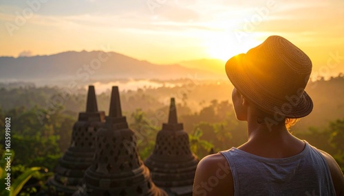 woman, sunrise, borobudur, temple, travel, tour tourism, vacation, asia, indonesia, culture, heritage, landmark, buddhist, historical building, morning, outdoors, exploration, holiday, summer, adventure, sightseeing, holiday maker, journey, trip, leisure, photo, architecture, spirituality, serene, peaceful, exotic, earth, famous, historic, nature, sky, landscape, sun, light, traditional, wanderlust, cultural, iconic, scenery, southeast