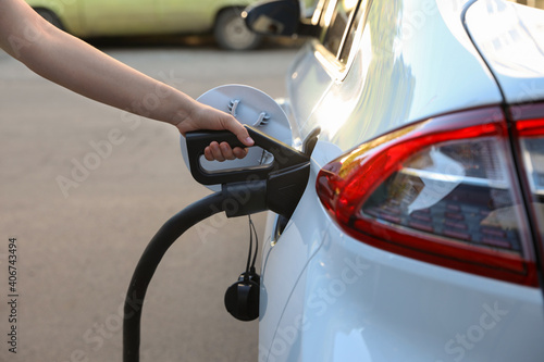 Woman inserting plug into electric car socket at charging station, closeup
