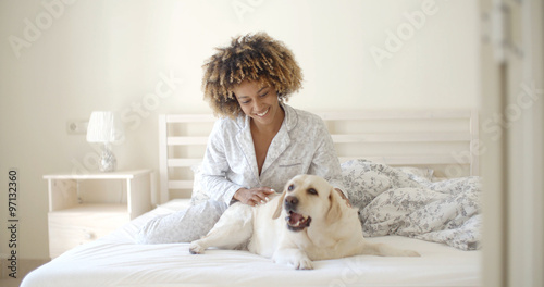 dog, bed, woman, young, pet, girl, holding, bedchamber, love, puppy, happiness, lifestyle, human relationships, laying, animal