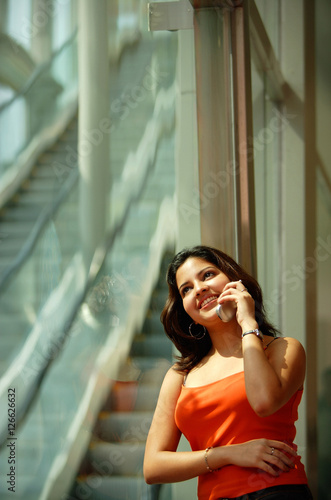 20s, asia, asian ethnicity, black hair, cheerful, communication, escalator, glasses, happiness, holding, indoor, leaning, leisure, lifestyle, listening, long hair, looking up, mobile phone, on the phone, one person, smiling, sunlight, tank top, toothy smile, vertical, wall, window, woman, young adult, photo