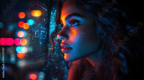 woman, female, portrait, profile, night, city, city landscape, light, bokeh, window, urban, futuristic, technology, neon, glow, dark, mysterious, modern, mood, dream, digital, abstract, artistic, beautiful, gaze, thoughtful, blue, orange, red, colourful, graphic, design, wallpaper, background