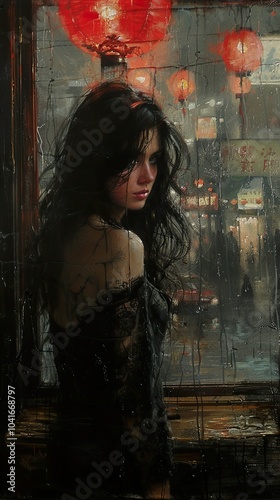 black dress, long hair, woman, gloomy, raindrop, city landscape, looking out, urban life, street scene, wet, dark, mood, painting, portrait, night time, background, night, window, street, artistic, urban, city life, glasses, city, dreamy, blurry, rain, melancholy, city lights, gaze, pensive, thoughtful, street light, night photography, lonely