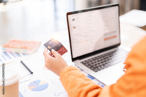 Woman makes a purchase on the Internet on the computer with credit card