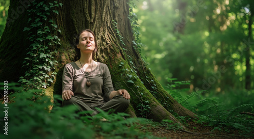 Woman meditating peacefully at the base of a large tree in a sunlit green forest