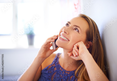 Woman, mobile and phone call in house on sofa with conversation, chat and communication for gossip. Girl, smartphone and talking in home with contact or smile for social, relax or planning discussion