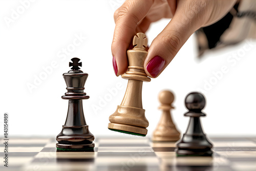 Woman moving chess piece on chess board game concept for ideas and competition and strategy, business success concept, business competition planing teamwork strategic concept.