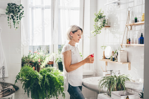 Woman of middle-aged staying in eco friendly white bathroom. Wooden shelves with cosmetics and toiletries against white tile wall. Minimalistic design. Wellness. Comfort home zone