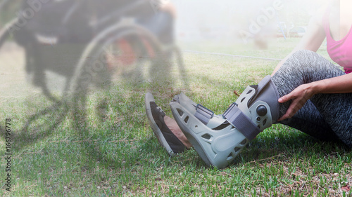 woman patient with short leg cast and wearing sport ware sitting on lawn and blurred background injured female sitting on wheelchair, health care concept