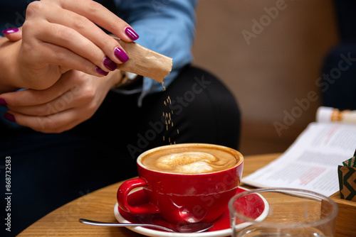 Woman pouring sugar from a small packet into her coffee on a cafe table. Close-up shot.
