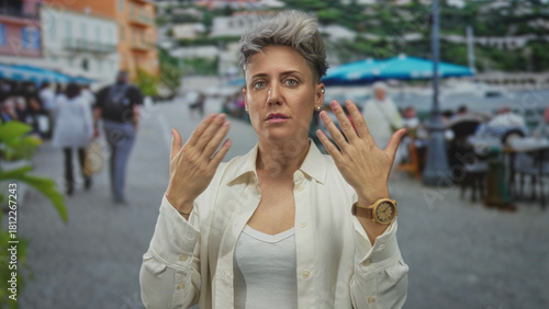 Woman pulls open shirt collar and fans chest to cool down on restaurant terrace outdoors; heat relief.