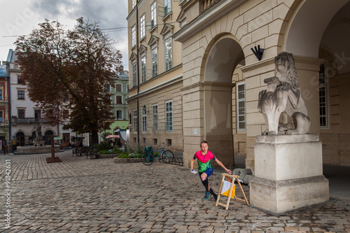 woman, sportsman, punching, control, point, symbol, orienteering, cp, checkpoint, sport, racing, competition, material, fabric, textile, stick, grass, orange, white, hang, hanging, navigate, leisure, activity, race, active, walk, lifestyle, orientation, direction, city, town, pass, wall, stone, old, ancient, paving, street, activewear, run, hurry, speed