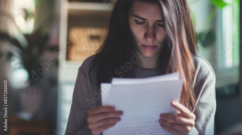 Woman reading a document, focused and thoughtful, in a cozy home environment with soft natural lighting.