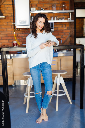 woman, business, computer, fashion, hand, love, food, person, girl, house, shopping, money, hot drink, cyberspace, technology, kitchen, phone, lifestyle, mobile, smart, mobile phone, female, reading, standing, communication, conversation, home, texting, mobile phone, attractive, call, chatting, smartphone, app, text, adult, beautiful, casual attire, caucasian, happy, message, smile, businesswoman, serious, brunette, enjoying, listening, middle-aged, mobility, relaxation