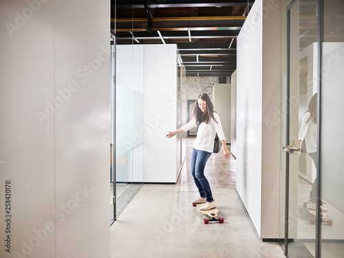 Woman riding longboard on office floor