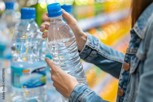 woman, hand, choosing, plastic, water bottle, supermarket, shelf, closeup, view, consumerism, selection, shopping, grocery, decision, sustainability, environmental impact, disposable, convenience, purchasing, healthy, option, variety, retail, market, transparent, freshness, hydratation, recycling, package, product, brand, price, comparison, modern, lifestyle