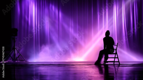silhouette, woman, stage, smoke, performance, contemplation, theatre, abstract, dramatic, artistic, show, conceptual, loneliness, solitude, inspiration, imagination, dream, shadow, vibrant, glowing, aethereal, mystery, art, entertainment, background, copy space, mood, creative, illumination, spotlight, high-coloured, concert, spectacle, darkness, sitting, chair, person, female, adult, backview, indoor, evening, night, colours, vertical, horizontal, studio
