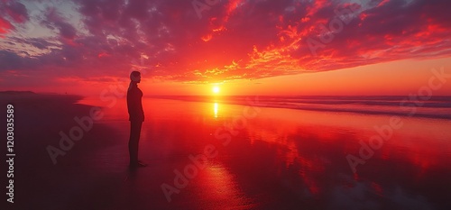 Woman silhouetted, ocean sunset, fiery sky, beach