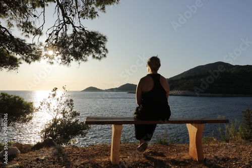 woman, seaview, soul, contemplative, relaxing, idylli, recreation, relaxation, calmness, sunset, water, nature, ocean, landscape, summer, blue, vacation, sun, travel, loneliness, pine, forest, sun ray, tree branch, coast, bay, scenic, atmosphere, hill, holiday, croatia, mediterranean, island, green, enchanting, romantic, light, evening, dreamlike, place, adriatic