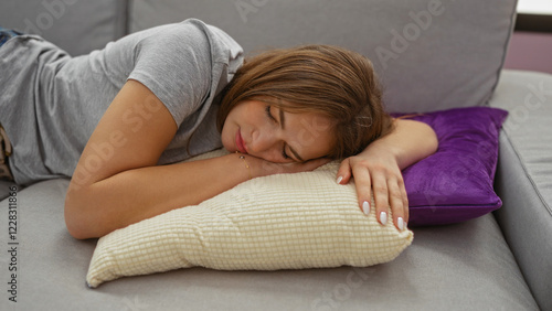 woman, sleeping, couch, living, room, home, indoor, pillow, relaxation, comfort, apartment, interior, sofa, resting, peaceful, serene, tranquil, cosy, calm, domestic, casual attire, elegant, young, adult, female, beautiful, attractive, caucasian, leisure, relax, to rest, unwind, nap, afternoon, restful, quiet, design, homelike, soft, fabric, decor, modern, style, comforting, chill, down, unplug, peace, harmony