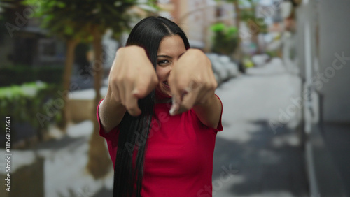 woman, smiling, red, shirt, city, street, day, pointing, cheerful, happy, urban, young, female, hispanic, joyful, bright, lifestyle, casual attire, posing, vibrant, energetic, fun, attractive, fashion, expression, beauty, long, hair, sharpened, stylish, modern, tied-up, unique, background, tree, building, sunlight, sociable, friendly, confident, person, charming, smile, gesture, interaction, lively