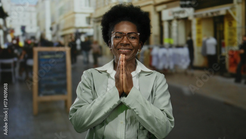 woman, smiling, prayer, city, street, goggles, joy, gratitude, sunlight, outdoors, african, american, lady, business, urban, shop, suit, gesture, happy, cafes, people, background, fashion, style, modern, lifestyle, daylight, friendly, positive, professional, relaxed, open, greeting, expression, confidence, casual attire, beautiful, afternoon, public, interaction, outfit, communication, scenic, downtown, bokeh, perspective, engagement, serene, glad