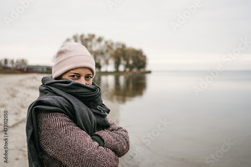 woman, winter, coast, cold, beach, nature, recreation, relaxation, season, weather, fashion, person, middle-aged, foulard, beanie, overcoat, shivering, smiling, eye, woolen, copy space, bleak, arms crossed, friendly, ocean, travel, sea, vacation, water, people, landscape, tour tourism, autumn