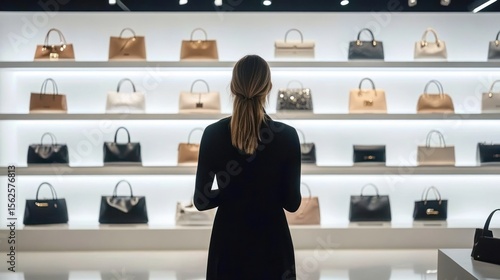woman, handbag, purse, shelf, fashion accessories, shopping, black dress, lighting, organised, front view, commerce, consumer, elegant, minimalist, indoor, choice, style, collection, high-end, trendy, presentation, fashion, selecting, backview