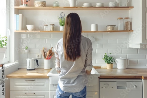 woman, front, sink, kitchen, wearing, white, shirt, blue, jean, many, shelf, item, including, bowl, home, several, cup, vase, female, young, food, indoor, lifestyle, cook, caucasian, person, table, preparation, beautiful, happy, adult, interior, light, house, modern, meal, housework, brown, apron, cookery, holding, healthy, space, room, household, morning, domestic, bright