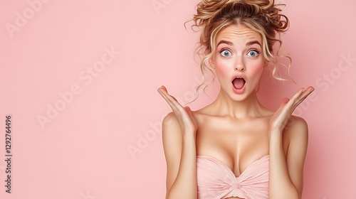 woman, surprise, pink, beauty, expression, portrait, girl, make-up, hair, attractive, excited, amazed, shocked, face, beautiful, happy, studio, photo, model, fashion, style, image, smiling, coiffure, stunning, shot