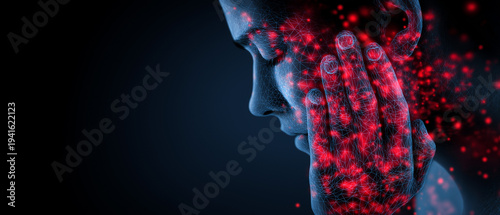 Woman touching her face with glowing particles in dark background. Measles outbreak medical concept. Person with Koplik spots and skin rash from highly contagious viral illness.