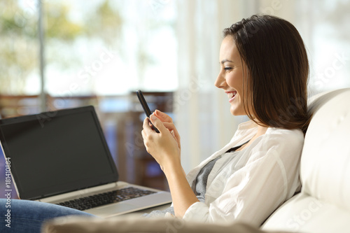 Woman using a phone and a laptop at home