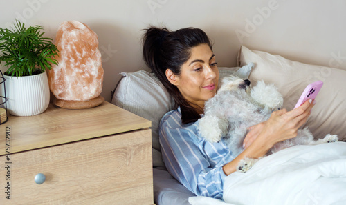 Woman using her phone and hugging her dog in the bed