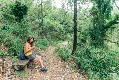 app, bag, bench, browsing, mobile phone, connection, countryside, daytime, device, digital, female, foliage, full body, full-length, contraption, horizontal, cyberspace, lifestyle, long hair, lush, mobile, nature, online, outdoors, pastime, path, phone, recreation, season, half face, to sit, smartphone, summer, surfing, tour tourism, holiday maker, traveler, trip, using, wanderlust, weekend, woman