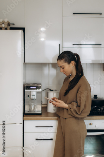 female, woman, kitchen, smartphone, hot drink, technology, morning, cosy, lifestyle, routine, home, domestic, interior, appliance, casual attire, device, cup, relaxing, relaxation, preparation, interior design, countertop, household, electric appliance, warm, outfit, activity, barista, beverage, espresso, relaxed, urban, comfortable, stylish, simple, minimalism, everyday, interact, interaction