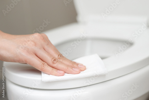 woman using tissue paper clean the toilet in the bathroom at home.