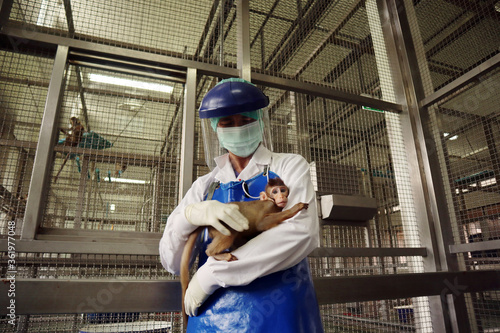 Woman veterinarian holding a little macaque monkey in the monkey cage.