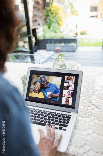Woman video chatting with family and friends on laptop screen
