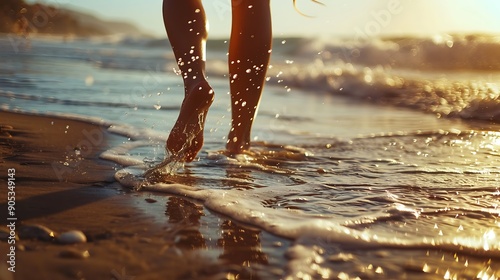 Woman Walking Along Beach, Feet Making Imprints in Wet Sand, Waves Lapping at Shore