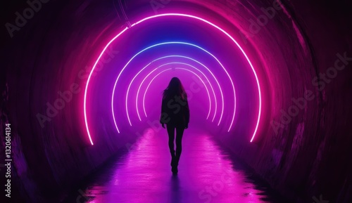 woman, walking, tunnel, neon, light, purple, pink, blue, background, futuristic, moody, reflective, glow, silhouette, circle, concentric, vibrant, dark, mystery, journey, path, technology, digital, art, graphic, design, abstract, style, image, photo, photo, modern, aesthetic, scene, lighting, visual, effect, commercial, stock