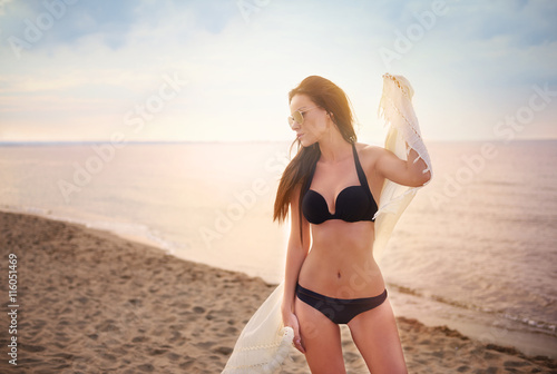 woman, beach, bikini, swimwear, shawl, holding, looking down, sunset, tan, summer, holiday, copy space, sun tanning, female, symbol, signs, travel destination, vacation, sunlight, beauty, sea, ocean, sand, sunglasses, maldives, brown hair, long hair, attractive woman, waist up, carefree, enjoyment, coastline, one person, pensive, sharpened, bodycare, outdoors, island, skincare
