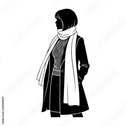 woman, adult, person, female, foulard, coat, clothing, accessory, fashion, style, black, silhouette, profile, side, view, portrait, graphic, design, minimalist, simple, line, art, drawing, symbol, logotype, template, digital, artwork, clip art, fashionable, trendy, dress, outfit, clothes rack, winter, cold, weather, seasonal, casual attire