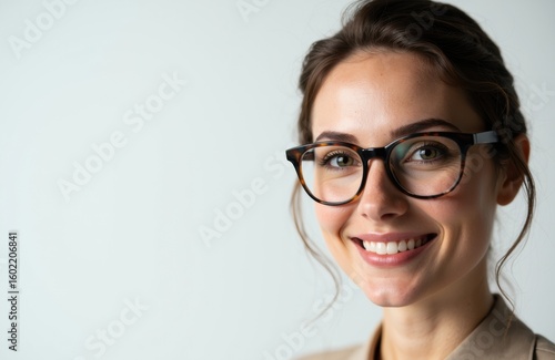 Woman wearing glasses smiling in close-up portrait with neutral background
