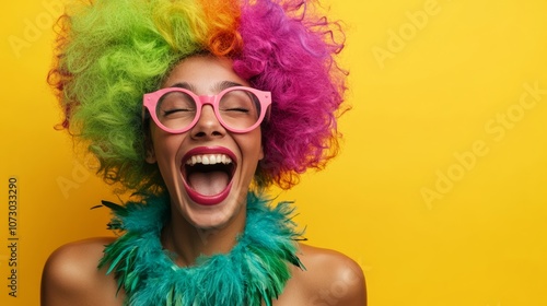 Woman with a colorful wig and glasses is smiling and laughing. She is wearing a green, blue, and pink feather headband