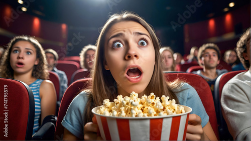 Woman with a surprised expression in crowded cinema. Shocked female viewer in movie theater. Bright facial expression, human emotions concept